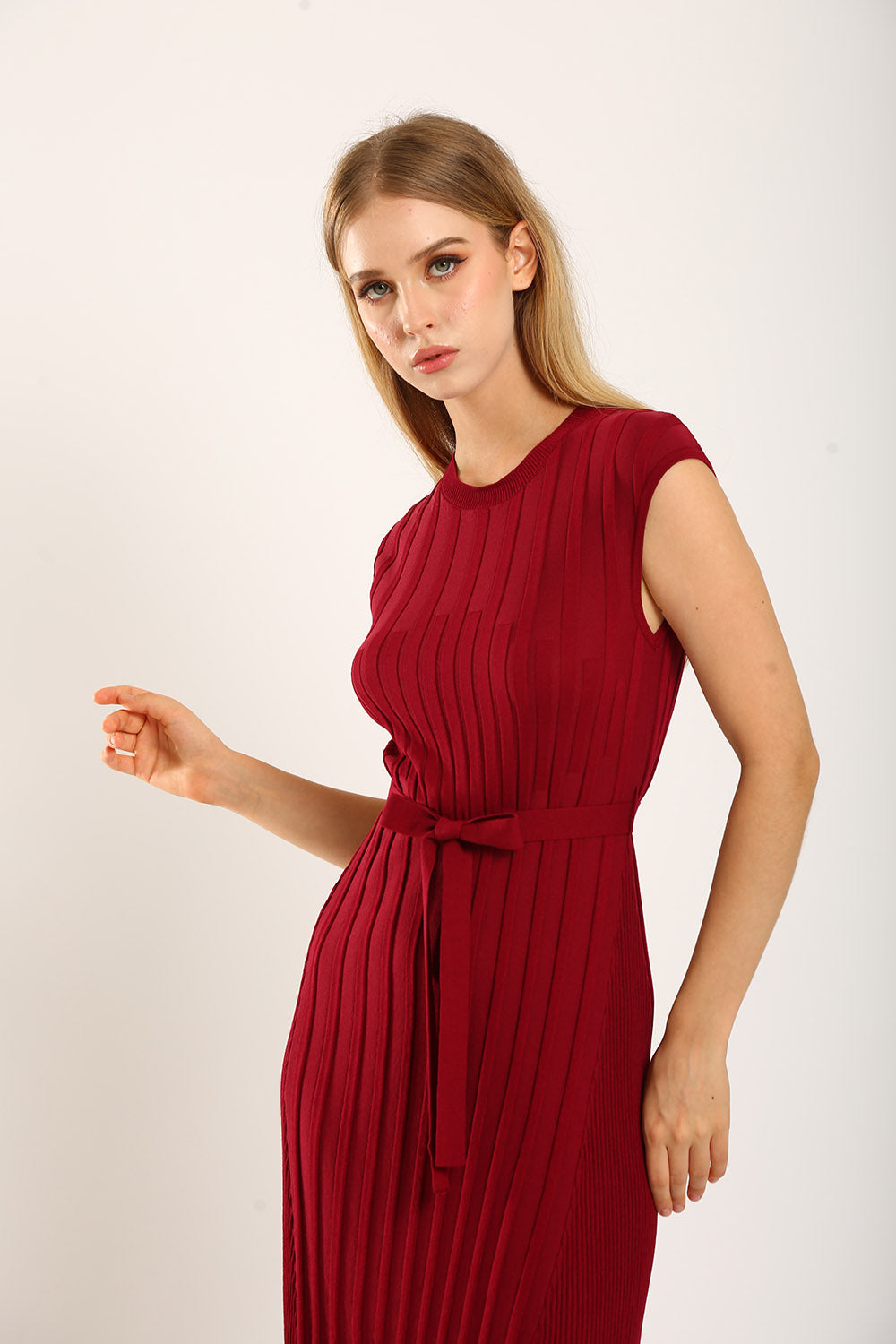Ciera Texture Belted Knit Dress in Red