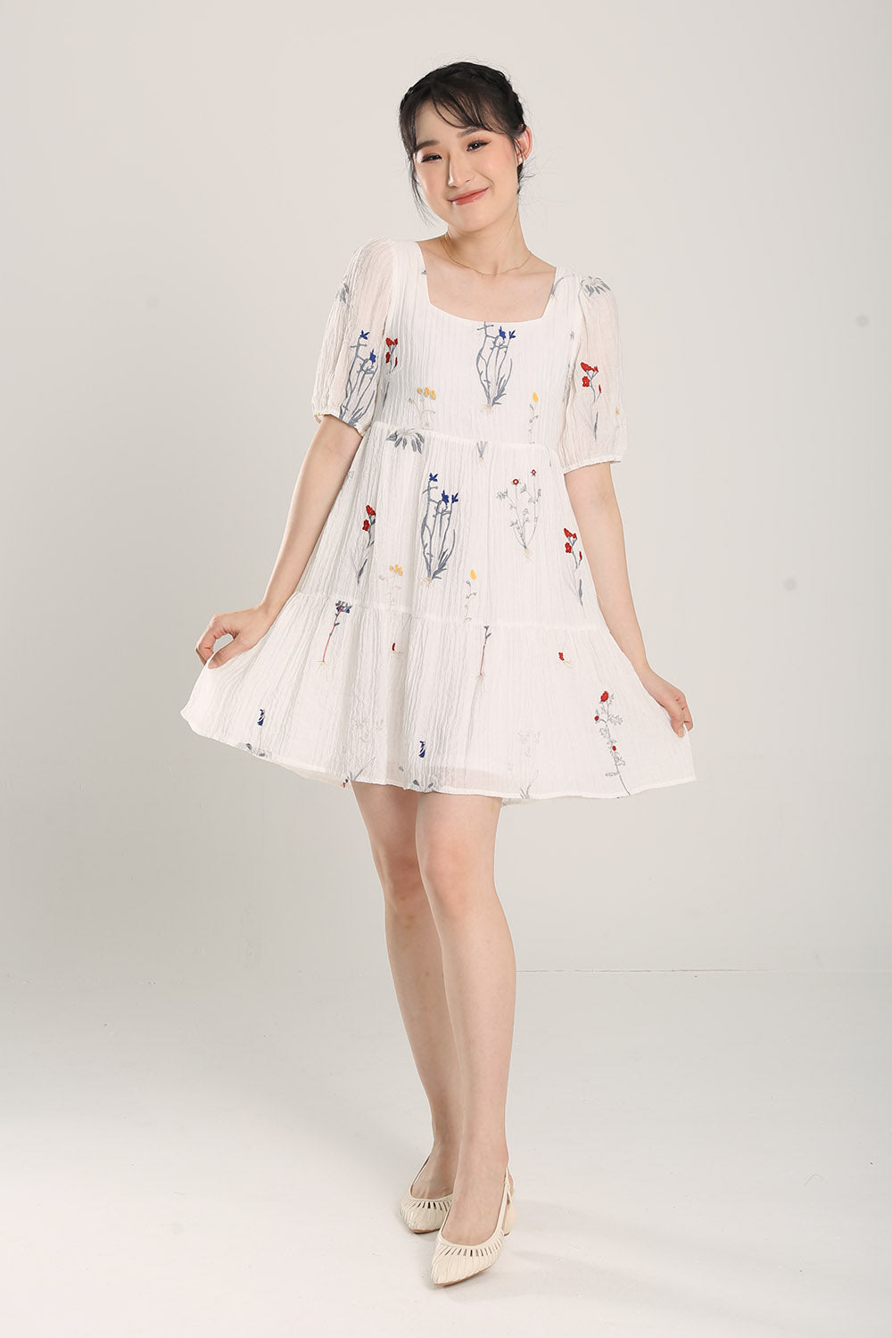 Textured polyester cotton material with embroidered florals, non-stretchable